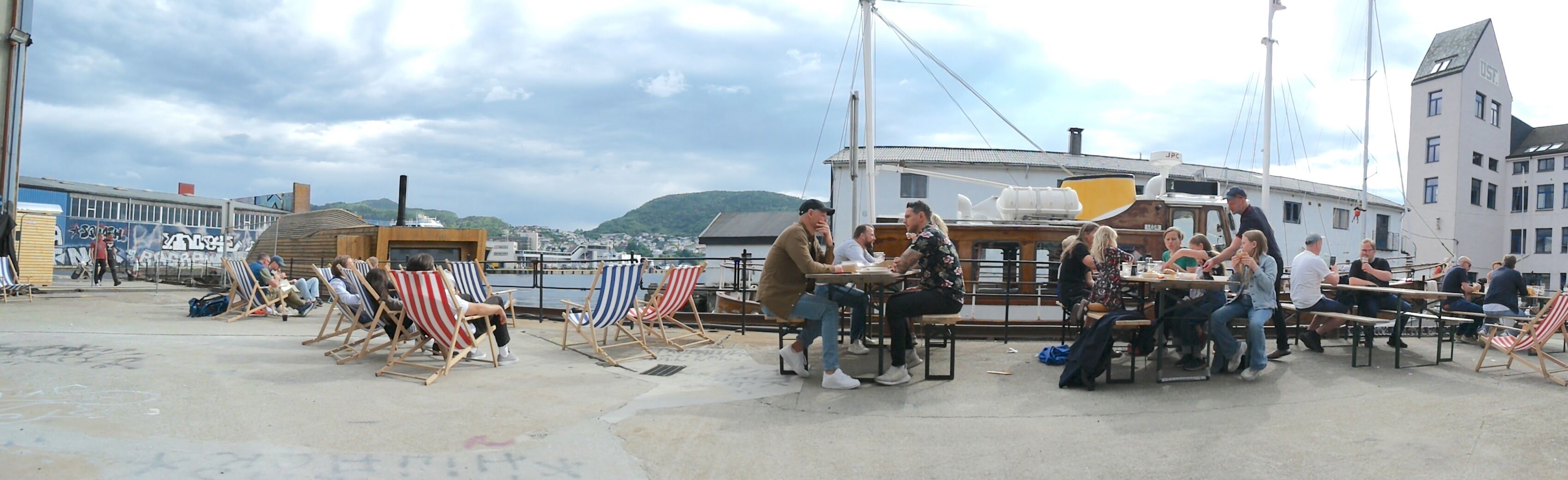 Vi har byens nydeligste uteservering langs sjøkanten. Her er det fint å være både i sol og overskyet vær. Deilig drikke og mat, måkesvev, fjordutsikt og solnedgang.